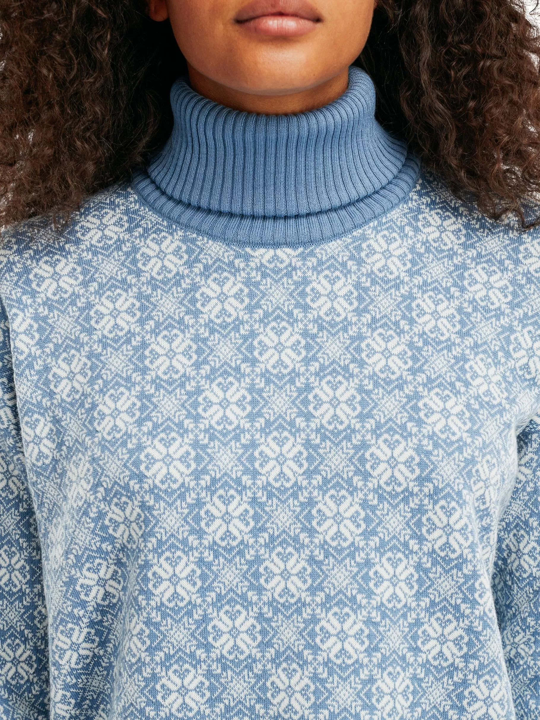 Dette Er En Nytolkning Av Var Sporty Frida Jakke: En Avslappet, Hoyhalset Ullgenser Med En Oppdatert Og Vid Passform. Genseren Har En Noe Lenger Rygg Enn Front. Det Heldekkende Monsteret Er Uendret, Bestaende Av En Avrundet Variant Av Den Tradisjonelle Attebladrosen.